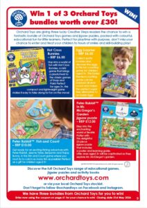Your chance to win any of these fabulous toys, books, games and resources – with £100’s of prizes in our latest giveaway!! – Including Plus-Plus Activity Sets, HUE Animation set & modelling clay, STEM kits from Brainstorm, inspiring books, games, toys and brand new Orchard Toys games bundles! (www.orchardtoys.com) – in our FREE to enter competitions!